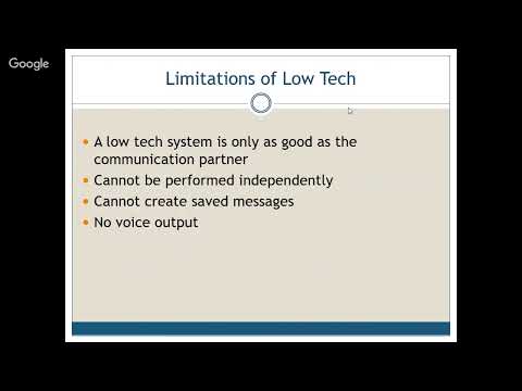 An overview of low tech communication, including some of the reasons why people use low tech. We will demonstrate different physical access methods: • Pointing by hand • Pointing with a laser (head mounted or handheld) • Eye Gaze • Scanning • Gestures